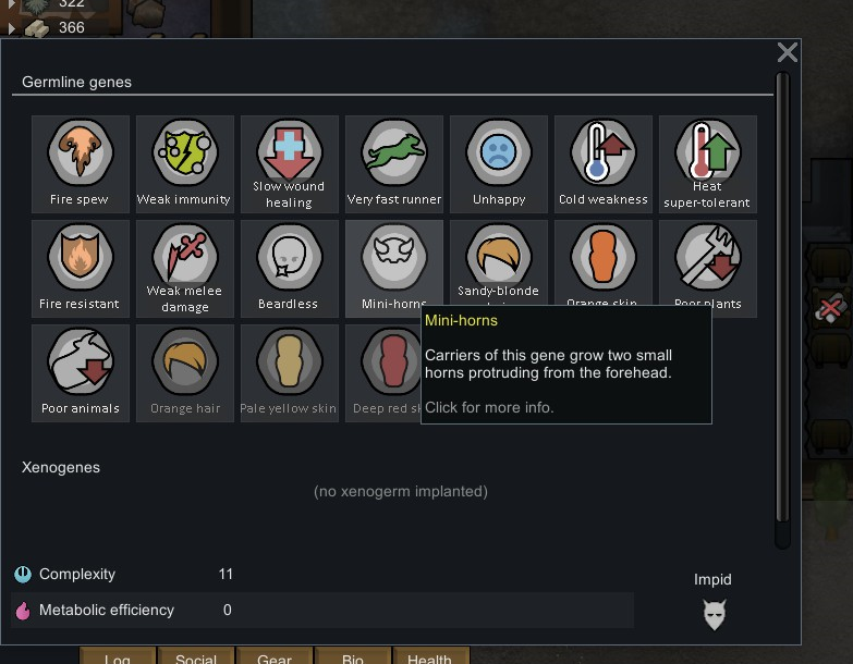 - Highmates: Carries no inheritable traits; they are incapable of violence, awful at planting and mining, but have higher social skills than average. They also provide buffs and mood buffs to himself/herself and the person he/she is in relationship with, but grants a mood debuff when they are not in the same map together.