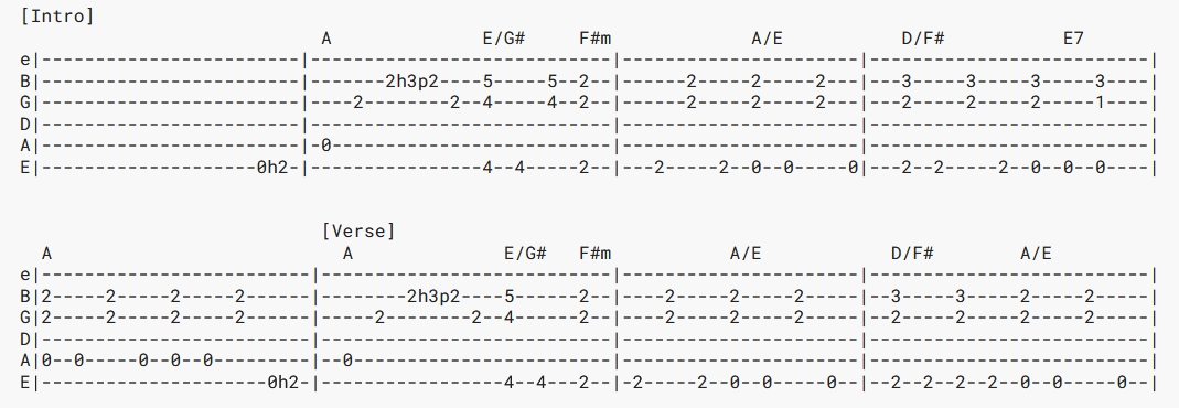 - "h": Repesents the guitar technique hammer-on. It is a guitar technique where you pick the first note and then, without picking again, use another finger to tap the higher note.
