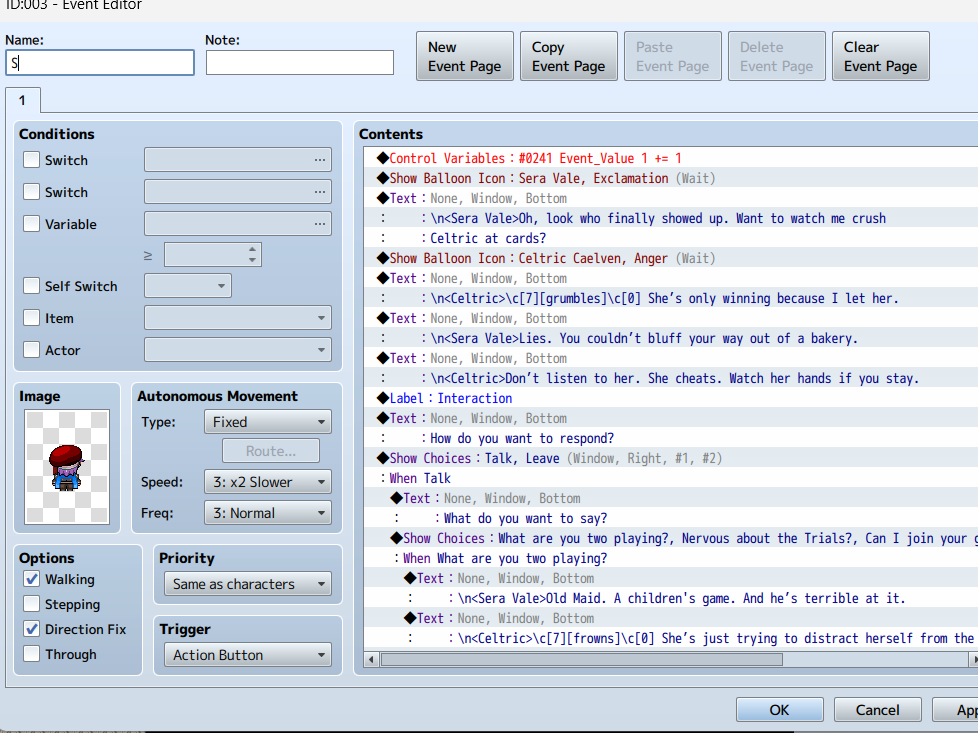 Oh boy, there were a lot of bugs that needed to be fixed which took quite a while to resolve. It was a real headache to deal it, had to revise, erase and create several parralel and autorun events. Actually, I also had to revice the coding of certain event objects.