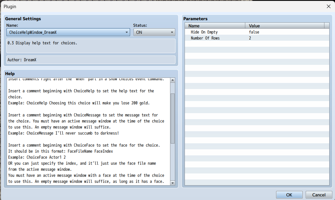 ChoiceHelpFix plugin by DreamX, edited by Caethyril and LargeChoiceHime plugin by Hime