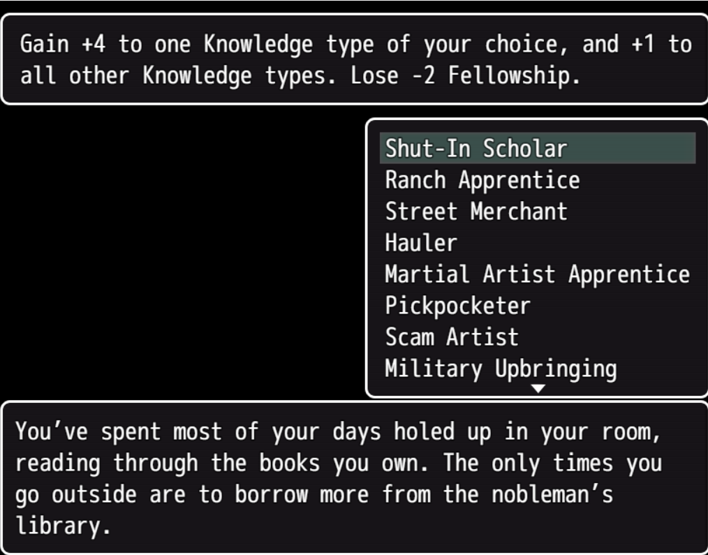 Attributes and Knowledge will have a crucial role in the game. There will be events that requires a Difficulty Check (DC) to achieve a different or preferable outcome.